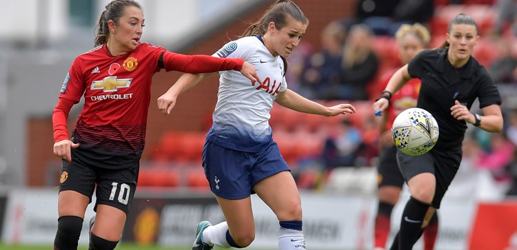 Spurs Ladies’ perfect start to the FA Women’s Championship came to an end with a 4-1 defeat to Manchester United at Leigh Sports Village on Sunday, writes Rosie Bonass.