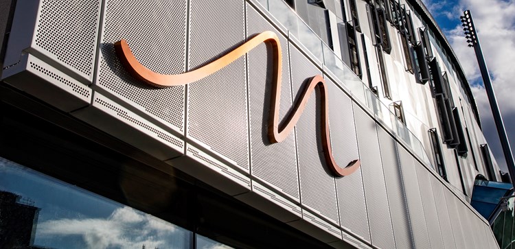 The flowing M brand identity displayed on the front of the building acknowledges the shapes that reflect the media, from soundwaves to paper rolling through a printing press, as well as a nod to the curved lines of our new home.