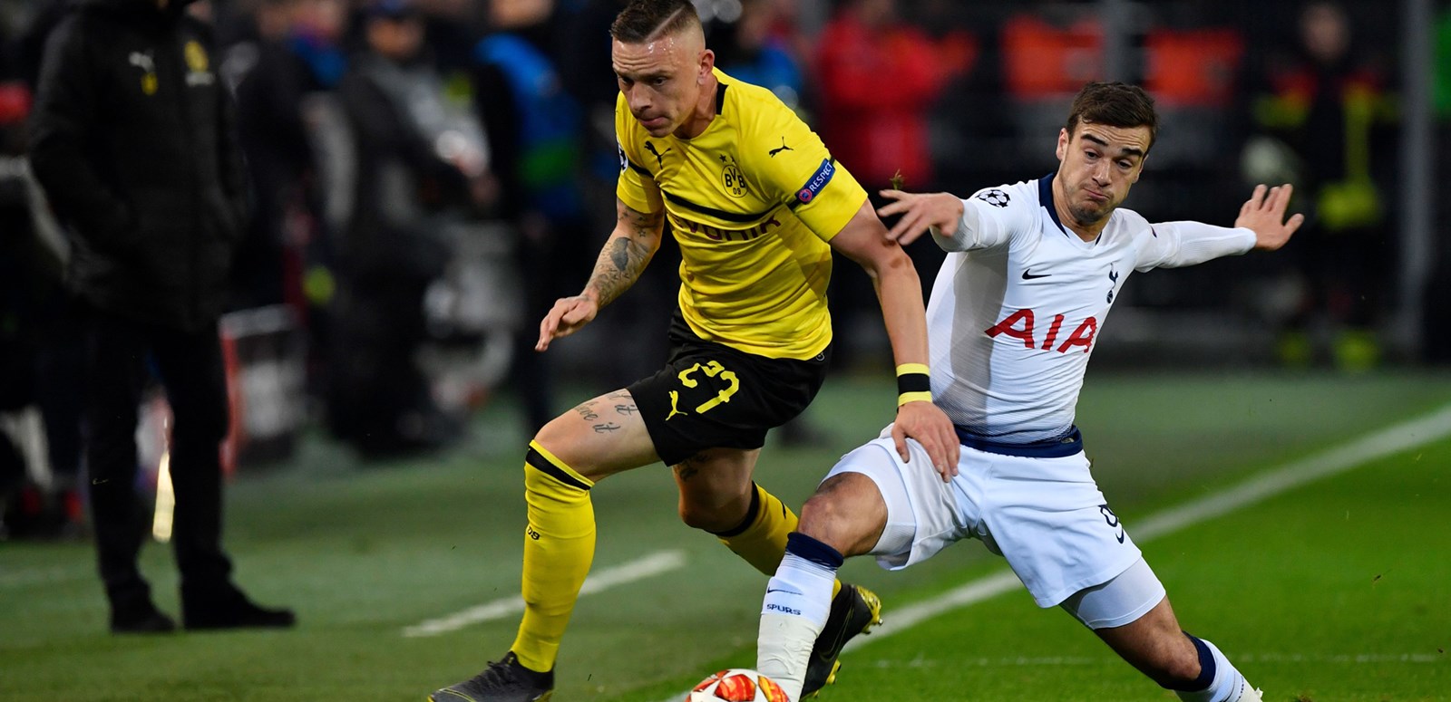 The first half was a story of admirable resilience in the face of a determined Dortmund side amid the deafening cauldron of Signal Iduna Park. The Bundesliga leaders, who made six changes to the side that lost at Wembley, hammered on the door at times, had 11 attempts at goal in that period - and that tally would have been more had it not been for some heroic defending inside the first 13 minutes as first Jan Vertonghen made a last-ditch tackle on returning skipper Marco Reus in the box before Davinson Sanchez vitally intervened at the near post to deny Paco Alcacer.