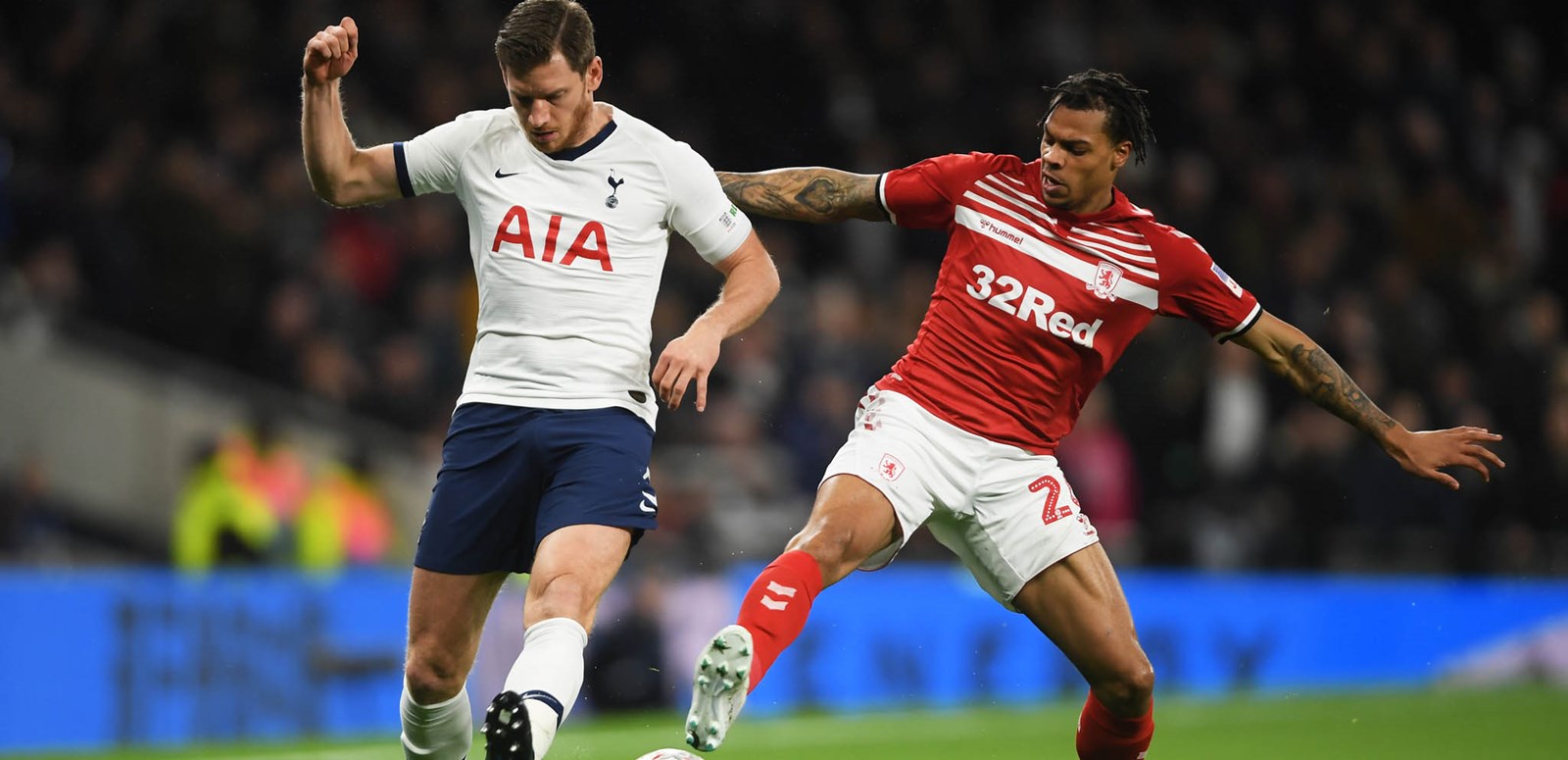 It was pretty much one-way traffic for the rest of the half. Lamela’s half-volley whizzed just over, Ryan Sessegnon broke through down the left channel and hit a low angled drive which Mejias tipped away for a corner and Tanganga almost got on the scoresheet when put away in the right channel but fired his shot just past the far upright. And when Christian Eriksen was brought down 22 yards from goal, the Dane stepped up for the free-kick but Mejias was equal to his low drive. Boro did have a spell of possession inside our half towards the end of the first period and a better final pass on occasions could have caused us problems, but when Vertonghen cut out a dangerous cross in the 39th minute, we countered with blistering speed, Lamela starting the break and Lucas finishing it, but unfortunately sliding his shot the wrong side of Mejias’ post and so we went in 2-0 ahead at the interval.