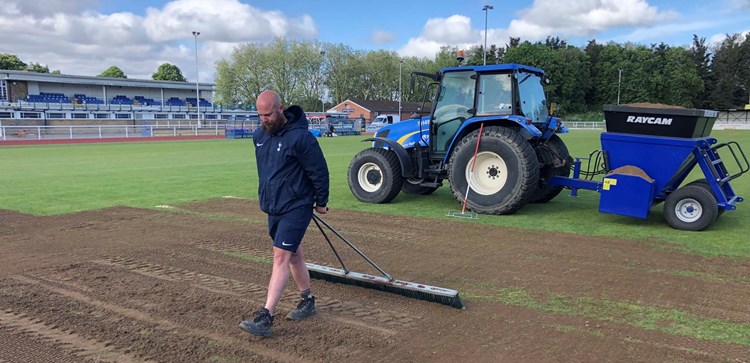 Work carried out involved aerating and top dressing the goal areas and touchlines, followed by an over-seeding and watering of the surface to give the grass the best possible chance of survival during the summer months.