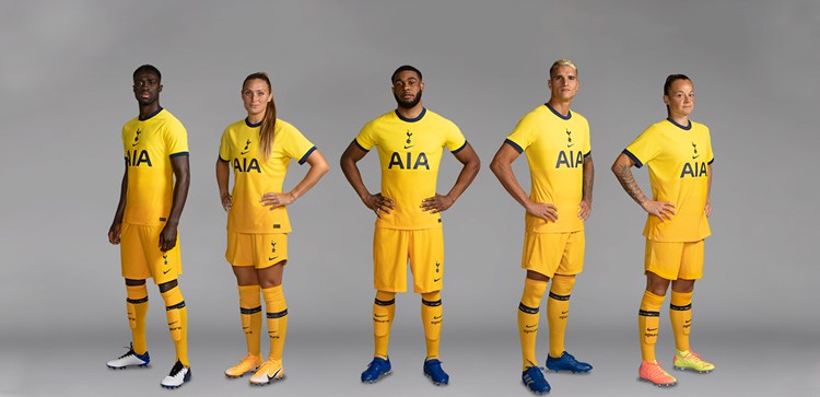 The kit is designed head-to-toe in yellow – a classic Spurs shirt colour – with a navy blue trim on a crew collar, shirt sleeves and socks. Subtle bands of yellow grow increasingly darker as they flow down the front of the jersey, owing to the influence of the iconic Nike Air Max 95 trainers, a popular style on the streets of north London.