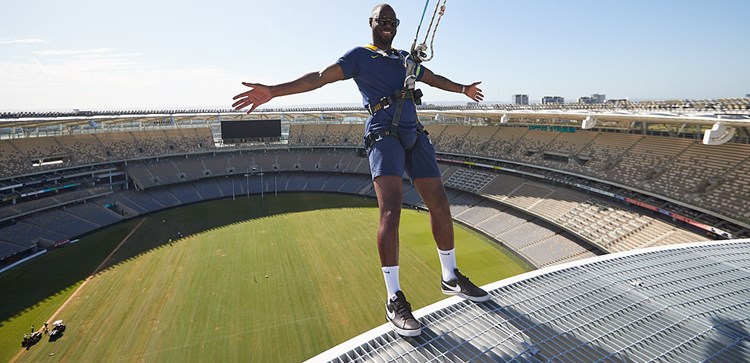 Harnessed from above, our legendary former skipper was able to lean over the edge of the stunning 60,000-capacity venue of our clash against the Hammers in Western Australia on Tuesday 18 July, taking in views of of Derbarl Yerrigan (Swan River), the Matagarup Bridge and incredible views of Perth City from the Western Viewing Deck.