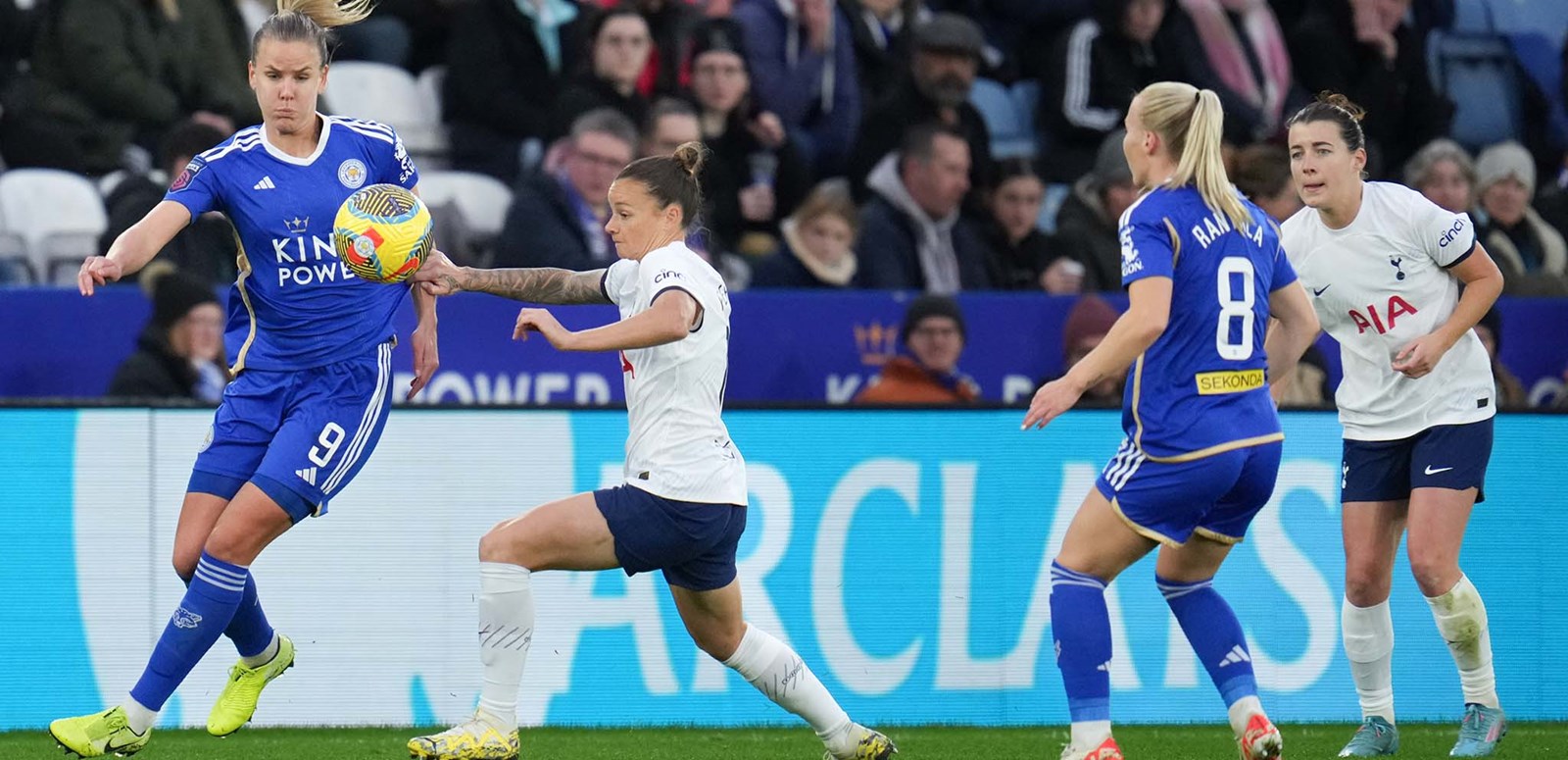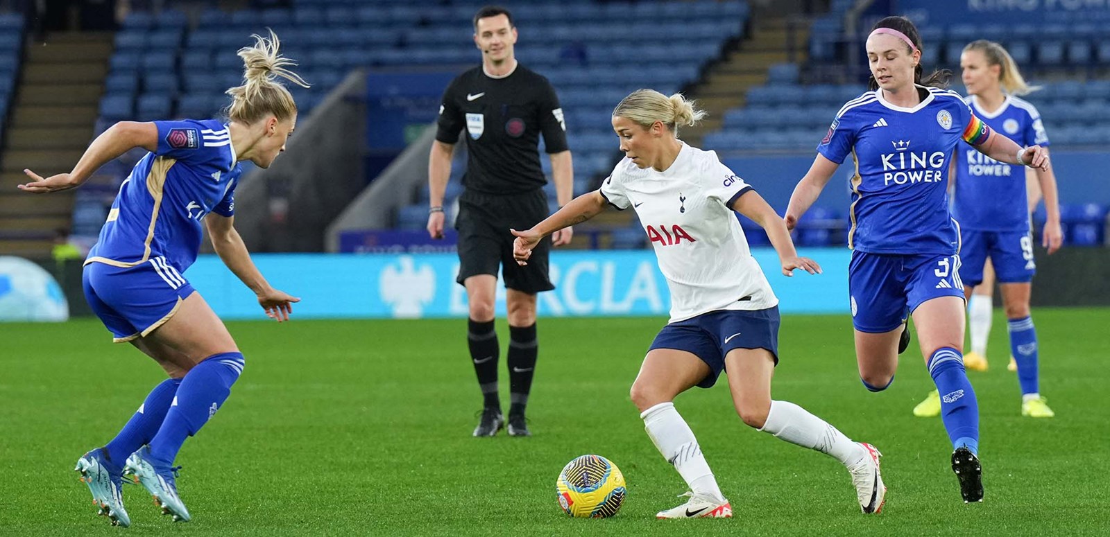 Leicester had further shots blocked in our box, including one from ex-Spur Josie Green, but we began to take control of the possession with just under a quarter-of-an-hour played, although we came unstuck in the 18th minute as the Foxes hit us on the break to take the lead, Hannah Cain's outside-of-the-foot pass in from the left flank converted in the middle by Cayman.