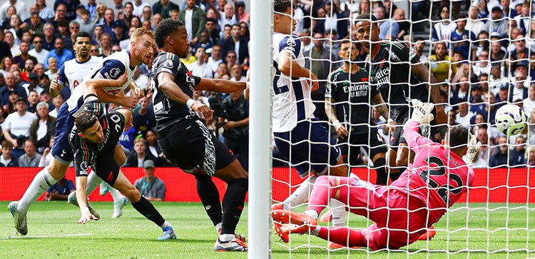This was an unusually early date in the calendar for a home north London derby and the stadium crackled with excitement and passion as the game kicked off. It was us on the front foot first, Dominic Solanke and Heung-Min Son combining on five minutes to fashion a chance for Dejan Kulusevski at the near post, David Raya pushing it away for a corner, before the Arsenal goalkeeper had to do the same to the Sweden international’s teasing cross into the box which eluded everyone and was creeping in moments later.