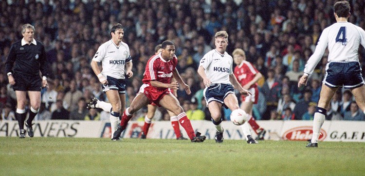 Above - Two of the greatest to ever play the game – Paul Gascoigne and John Barnes – do battle at the Lane in our 1-0 win in March 1990...