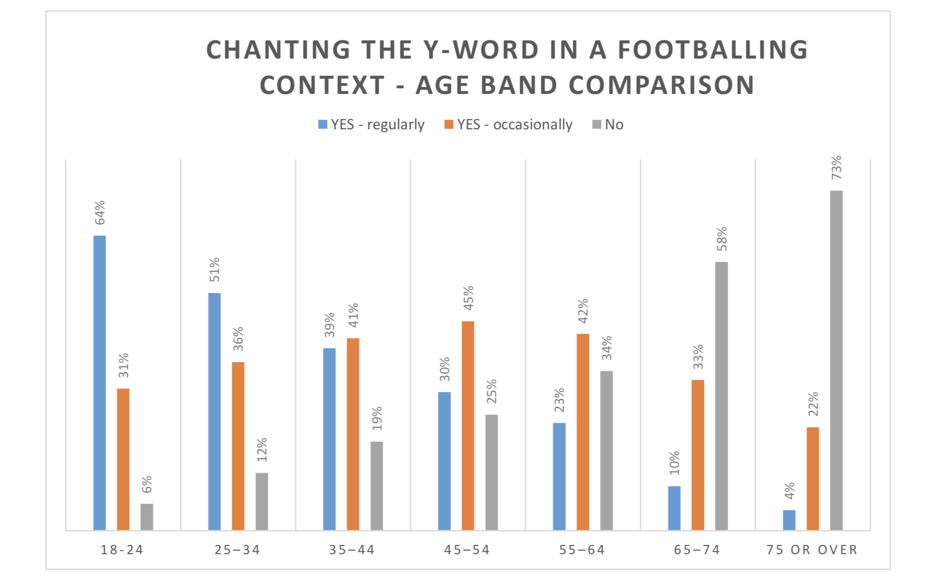 In addition to this, among those that chant the Y-word in a footballing context ‘regularly’ or ‘occasionally’, 30% would like to see a change with 23% preferring it was chanted less and 7% favouring fans stopped using the term.