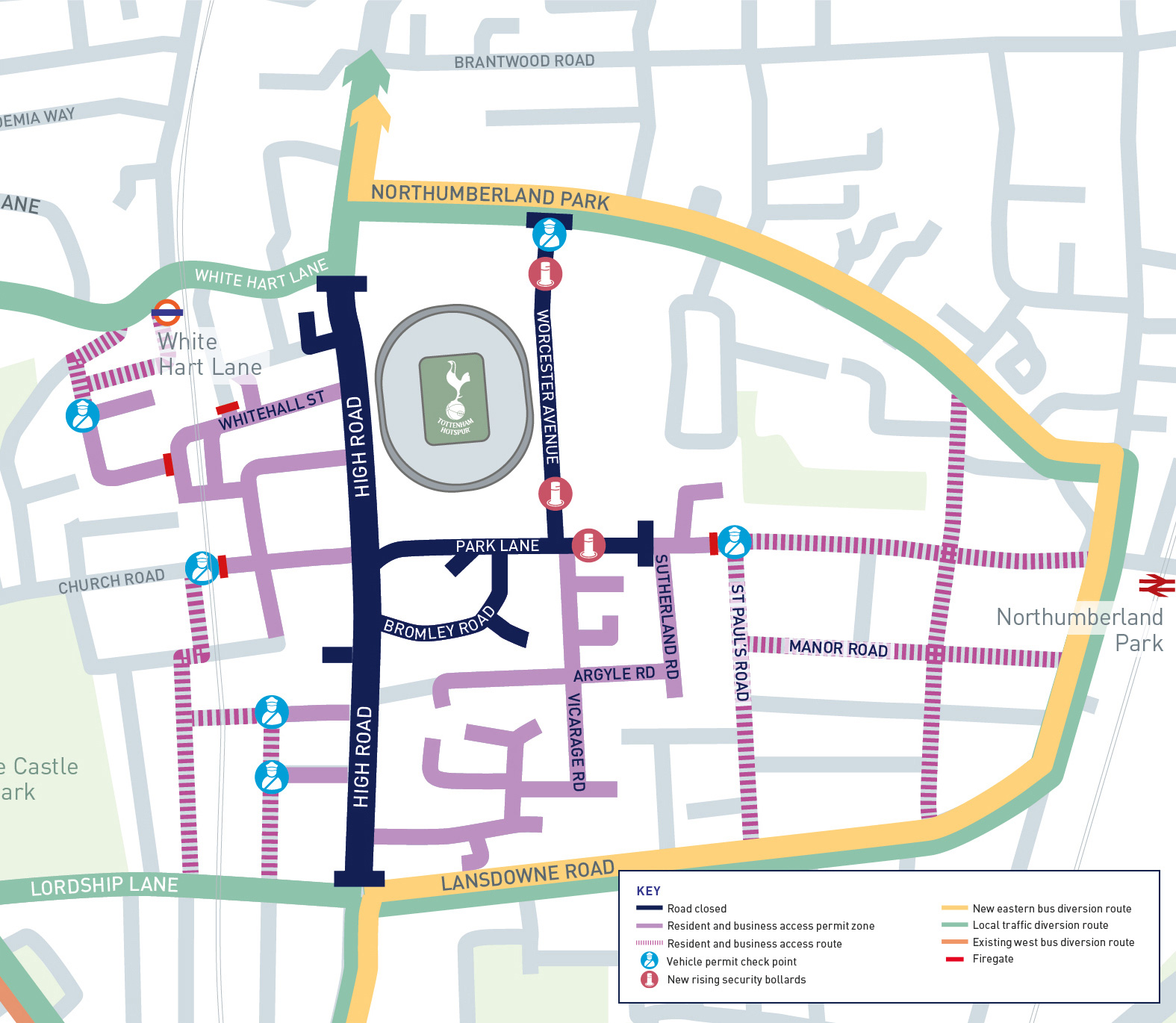 Love Lane and Whitehall Street also have all parking bays suspended on a matchday and are closed for up to one and half hours after a match to cater for queues at White Hart Lane station.