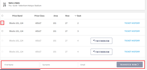 5. Once selected all of your available tickets will be displayed. To transfer a ticket select the box next to the seat number. Enter the first name, surname and email address of the person you would like to send the ticket to then select “Transfer Now”.